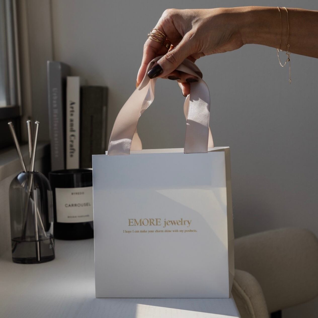 EMORE jewelryのギフトバッグには、ブランドロゴとともに、