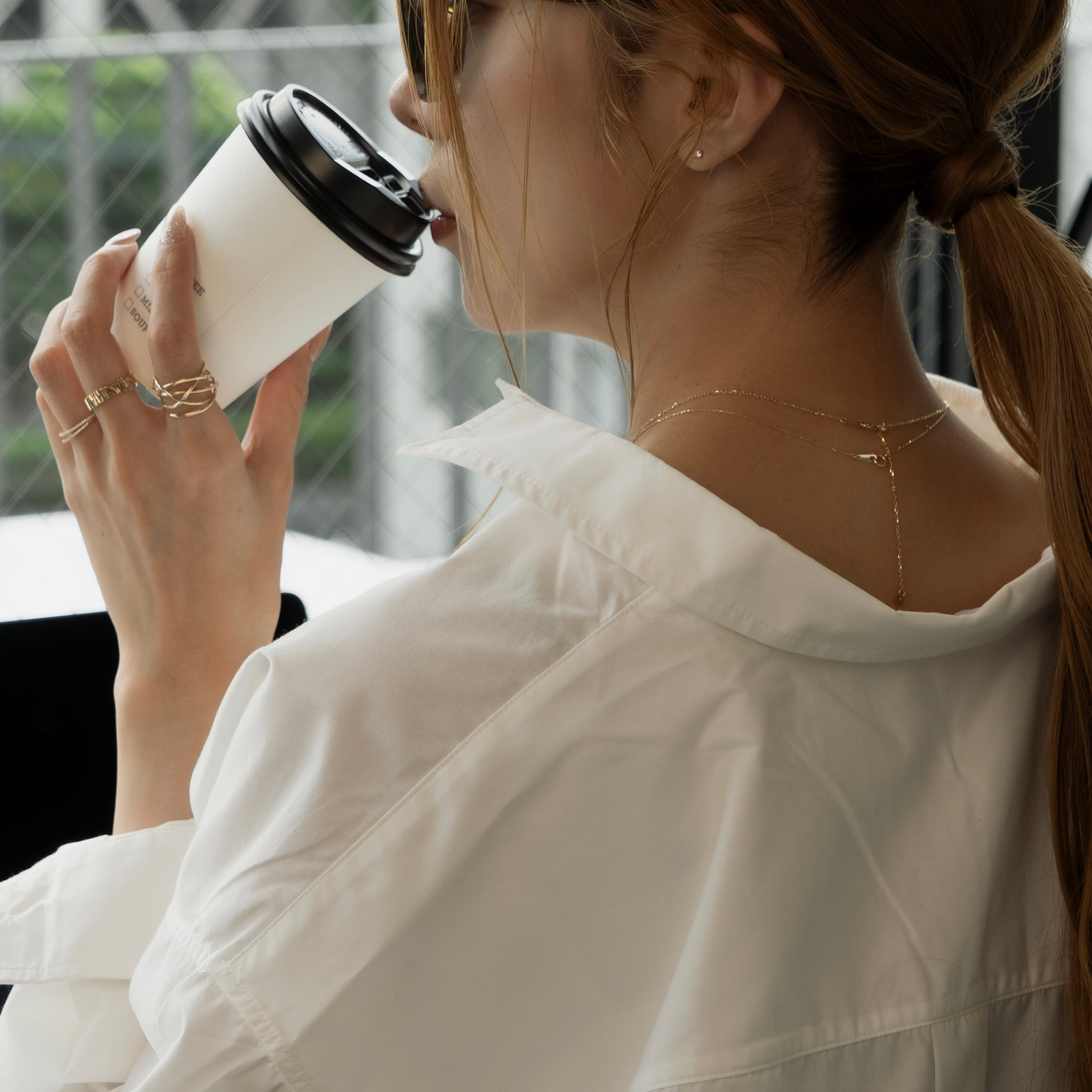 0.1mmの極細チェーンが作りだす滑らかなラインが上質な輝きが、洗練されたモード感と静かな存在感を併せ持ちます。
